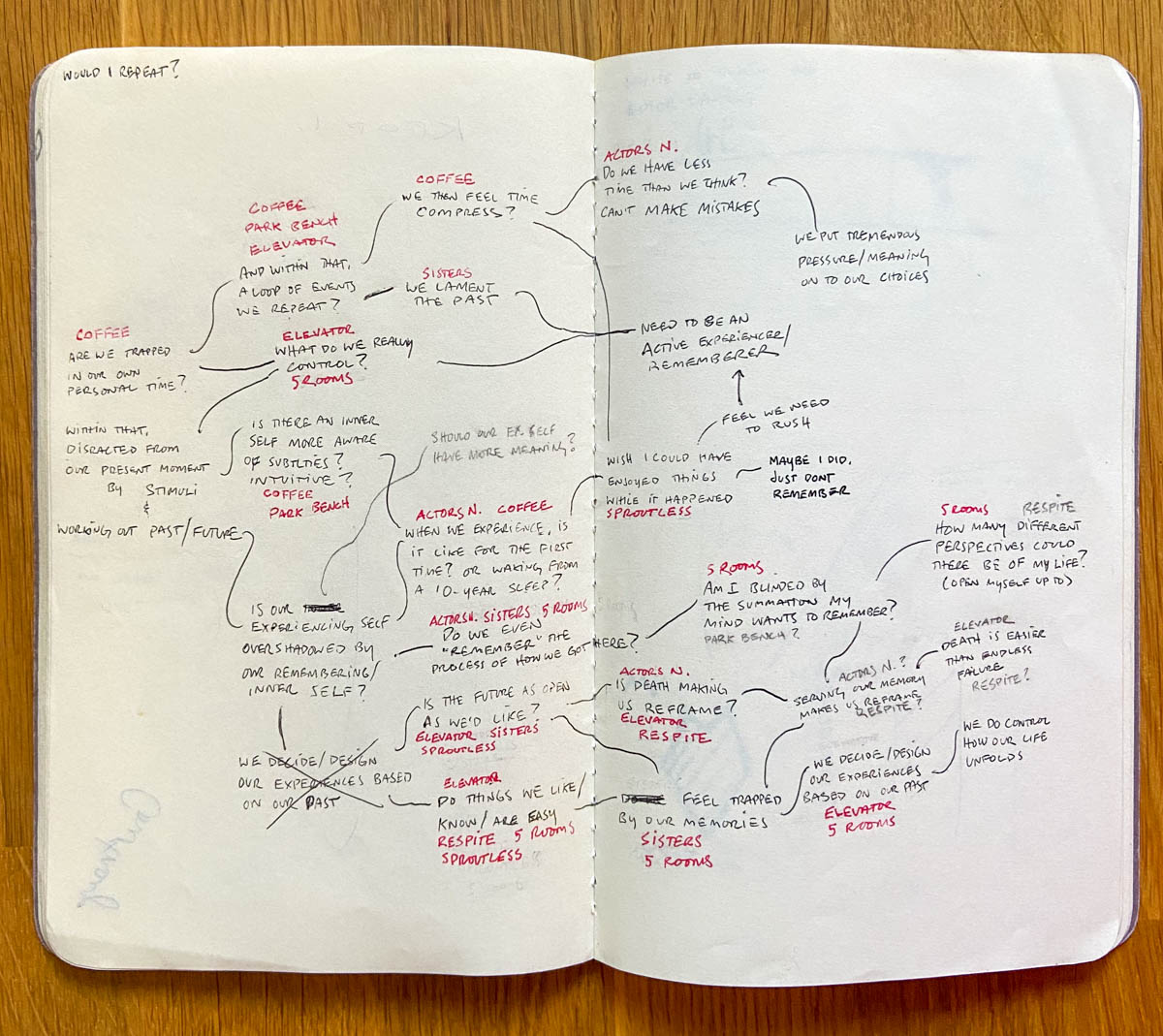 I wanted to explore what drives us as humans, how our identity comes to be, and how they are intertwined. So with Daniel Kahneman as my guide, particularly his work on the Experiencing Self and the Remembering Self, and my oft-researched theories on time and death, I envisioned a piece that explores how our own personal time constantly manipulates our experience. As much as we’d like to imagine time in various ways, we live a constant linear trajectory (within our observable dimensions). But what does all that do for us? While physicists obsess over the beginning of time and its spacial relationships, we as humans are plagued by its ending and the ability of our past to feel like it compresses or repeats itself. While we proceed in a linear world of cause and effect, our time often feels recursive: the same day every day, making the same mistakes, our hearts holding onto the past, days and weeks bleeding into each other, judgements on ourselves trapping us in loops. I conceived of a mythology where each night when you go to sleep, your subconscious mind in some undisclosed dimension is faced with the decision to either rewind 24 hours and relive your day again, or move forward with time. The caveat is that your conscious mind doesn’t know this rewinding exists, and therefore will not remember the previous day if you decide to repeat it. In fact, your memory of any previous drafts of a day gets wiped from your subconscious as well, so it doesn’t know if you’ve already repeated the day. Potentially you could get caught in an endless loop of reliving the same day over for decades without even knowing it. The final piece is: whenever you decide to move forward and not repeat, you “jump” forward by however many days you repeated, as if the temporal dimension has its own static existence and you are the variable. Does this explain why some days in our past are so vivid while others seem lost forever? It asks the question: how do we chose to spend our time in this life?