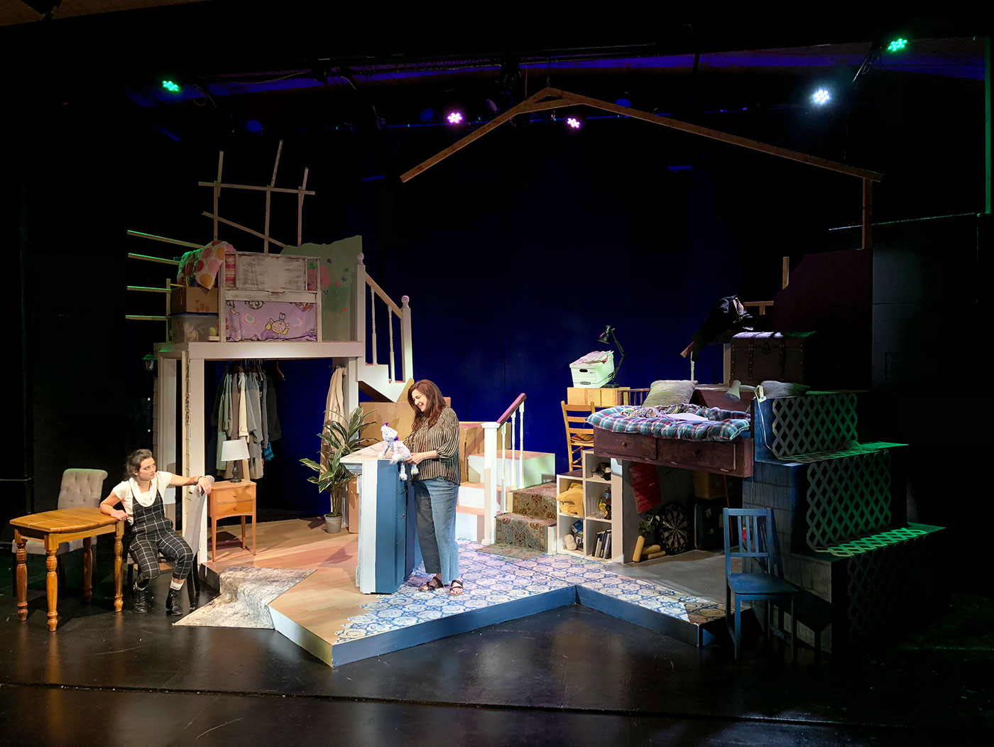 As Sheila returns to her childhood house and must unpack all her memories and personalities throughout the play, she is confronted by her new neighbor, Courtney, a representation of her younger self. I embodied this duality by smashing the two neighboring houses together into one, and designed an abstracted, encapsulated idea of “home”—a paradoxical funhouse expression of Sheila’s inner conflict that embraced AND instead of OR.